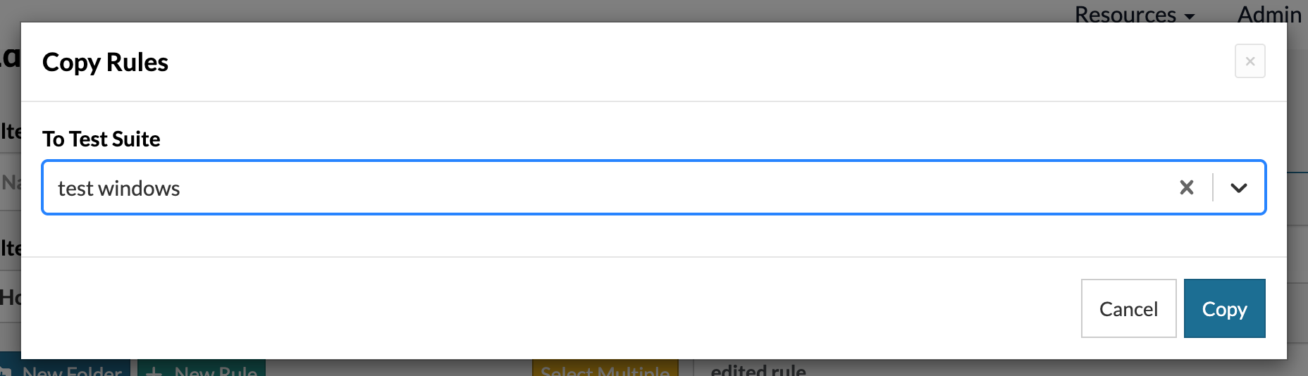 The new copy rules button in testRigor lets you duplicate reusable rules to other test suites efficiently. Choose from two methods: For a single rule copy, select one rule and click the Copy button. A modal opens where you pick the target test suite or suites. For bulk copy, click the new Select Multiple button to choose multiple rules or entire folders. Use Cancel to abort or Copy to proceed. Target test suites are pre-selected.
